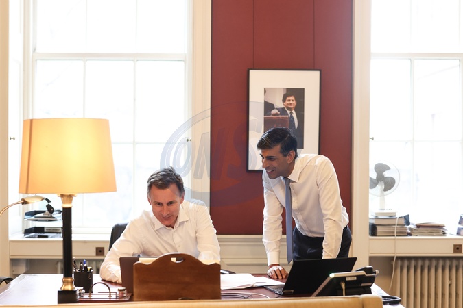 29/02/2024. London, United Kingdom. Prime Minister Rishi Sunak speaks with the Chancellor of the Exchequer Jeremy Hunt in the Chancellors Office in 11 Downing Street as they prepare for the annual Budget statement on March 6th., Credit:Simon Dawson / Avalon
