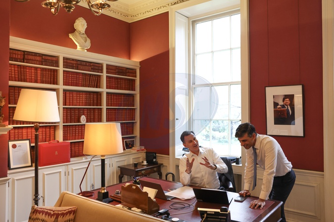 29/02/2024. London, United Kingdom. Prime Minister Rishi Sunak speaks with the Chancellor of the Exchequer Jeremy Hunt in the Chancellors Office in 11 Downing Street as they prepare for the annual Budget statement on March 6th., Credit:Simon Dawson / Avalon