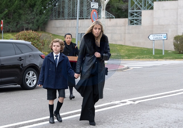 La veuve de Fernando Gomez-Acebo, Nadia Halamandari, et son fils Nicolas - Obsèques de Fernando Gomez-Acebo (cousin du roi Felipe VI d'Espagne) à Madrid. Le 2 mars 2024 Fernando Gomez-Acebo (King Felipe of Spain first cousin and son of Emerit King Juan Carlos sister Pilar de Borbon) funeral Chapel at La Paz Tanatory. Madrid - March 2, 2024.