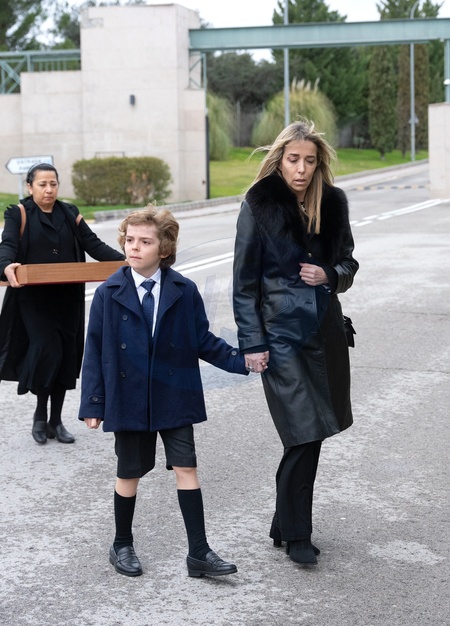 La veuve de Fernando Gomez-Acebo, Nadia Halamandari, et son fils Nicolas - Obsèques de Fernando Gomez-Acebo (cousin du roi Felipe VI d'Espagne) à Madrid. Le 2 mars 2024 Fernando Gomez-Acebo (King Felipe of Spain first cousin and son of Emerit King Juan Carlos sister Pilar de Borbon) funeral Chapel at La Paz Tanatory. Madrid - March 2, 2024.