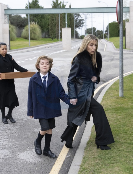 La veuve de Fernando Gomez-Acebo, Nadia Halamandari, et son fils Nicolas - Obsèques de Fernando Gomez-Acebo (cousin du roi Felipe VI d'Espagne) à Madrid. Le 2 mars 2024 Fernando Gomez-Acebo (King Felipe of Spain first cousin and son of Emerit King Juan Carlos sister Pilar de Borbon) funeral Chapel at La Paz Tanatory. Madrid - March 2, 2024.