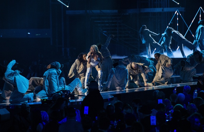 Calvin Harris and Ellie Goulding performing live at the 2024 BRIT awards ceremony, O2 Arena, London, on 2 March 2024