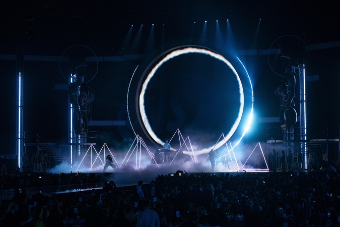 Calvin Harris and Ellie Goulding performing live at the 2024 BRIT awards ceremony, O2 Arena, London, on 2 March 2024