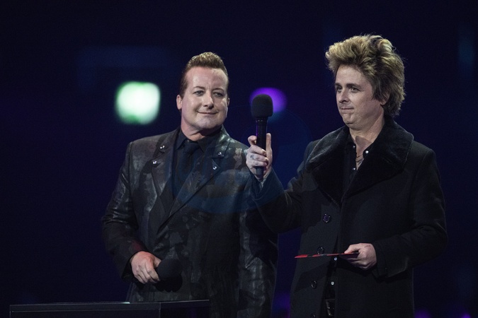Tré Cool and Billie Joe Armstrong of Green Day presenting the BRIT Award for Group of the Year at the 2024 BRIT Awards at The O2 Arena, London on 2 March 2024EDITORIAL USE ONLY, Credit:Dafydd Owen / Avalon