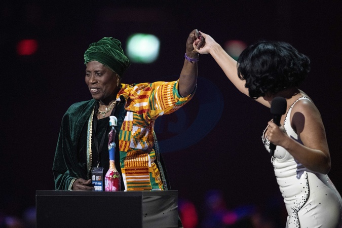 RAYE being presented the BRIT Award for Album of the Year at the 2024 BRIT Awards at The O2 Arena, London on 2 March 2024RAYE with her Grandmother AgathaShe's receiving the award for her album "My 21st Century Blues”English singer and songwriter from South London. She is best known for featuring on the '16 single "By Your Side". She was short-listed for the BBC Music Sound of... award for '17 and was named in third place. Her recent EP "Side Tape" has just been released.EDITORIAL USE ONLY, Credit:Dafydd Owen / Avalon