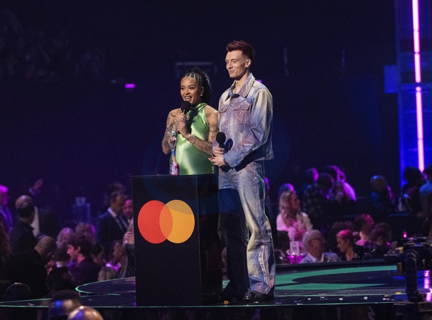 Yinka Bokinni and Jack Saunders presenting the BRIT Award for International Group of the Year at the 2024 BRIT Awards at The O2 Arena, London on 2 March 2024