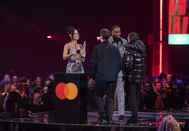Vick Hope and Ivan Toney presenting the BRIT Award for Producers of the Year at the 2024 BRIT Awards at The O2 Arena, London on 2 March 2024