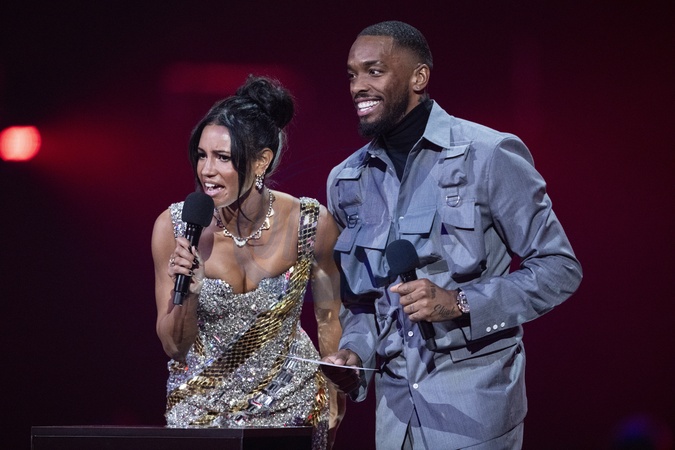 Vick Hope and Ivan Toney presenting the BRIT Award for Producers of the Year at the 2024 BRIT Awards at The O2 Arena, London on 2 March 2024