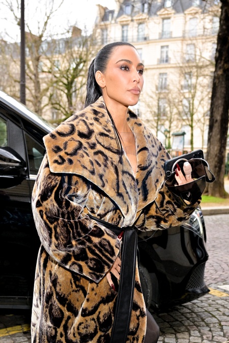 Kim Kardashian s'est blessée aux doigts de la main gauche, dans un manteau de fourrure à imprimé animal Balenciaga, arrive pour un RDV chez Maison Margiela en marge de la mode femme automne / hiver 2024-2025 lors de la Fashion Week de Paris (PFW), à Paris, France, le 3 mars 2024. Kim Kardashian, injured the fingers on her left hand, in a Balenciaga animal print fur coat, arrives for an appointment at Maison Margiela on the sidelines of Fall/Winter 2024-2025 women's fashion during Paris Fashion Week (PFW) , in Paris, France, on March 3, 2024.