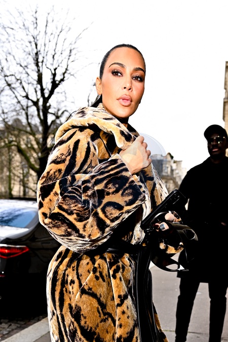 Kim Kardashian s'est blessée aux doigts de la main gauche, dans un manteau de fourrure à imprimé animal Balenciaga, arrive pour un RDV chez Maison Margiela en marge de la mode femme automne / hiver 2024-2025 lors de la Fashion Week de Paris (PFW), à Paris, France, le 3 mars 2024. Kim Kardashian, injured the fingers on her left hand, in a Balenciaga animal print fur coat, arrives for an appointment at Maison Margiela on the sidelines of Fall/Winter 2024-2025 women's fashion during Paris Fashion Week (PFW) , in Paris, France, on March 3, 2024.