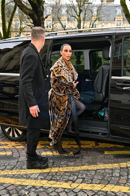 Kim Kardashian s'est blessée aux doigts de la main gauche, dans un manteau de fourrure à imprimé animal Balenciaga, arrive pour un RDV chez Maison Margiela en marge de la mode femme automne / hiver 2024-2025 lors de la Fashion Week de Paris (PFW), à Paris, France, le 3 mars 2024. Kim Kardashian, injured the fingers on her left hand, in a Balenciaga animal print fur coat, arrives for an appointment at Maison Margiela on the sidelines of Fall/Winter 2024-2025 women's fashion during Paris Fashion Week (PFW) , in Paris, France, on March 3, 2024.