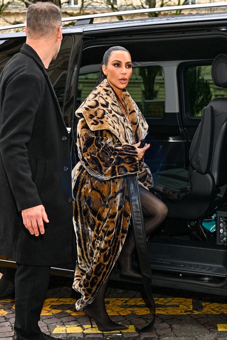 Kim Kardashian s'est blessée aux doigts de la main gauche, dans un manteau de fourrure à imprimé animal Balenciaga, arrive pour un RDV chez Maison Margiela en marge de la mode femme automne / hiver 2024-2025 lors de la Fashion Week de Paris (PFW), à Paris, France, le 3 mars 2024. Kim Kardashian, injured the fingers on her left hand, in a Balenciaga animal print fur coat, arrives for an appointment at Maison Margiela on the sidelines of Fall/Winter 2024-2025 women's fashion during Paris Fashion Week (PFW) , in Paris, France, on March 3, 2024.