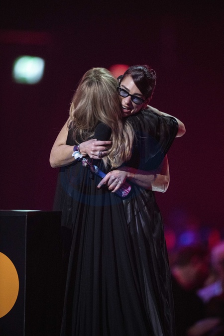 Dua Lipa presenting the BRIT Award for Global Icon at the 2024 BRIT Awards at The O2 Arena, London on 2 March 2024 - hugging Kylie MinogueEDITORIAL USE ONLY, Credit:Dafydd Owen / Avalon