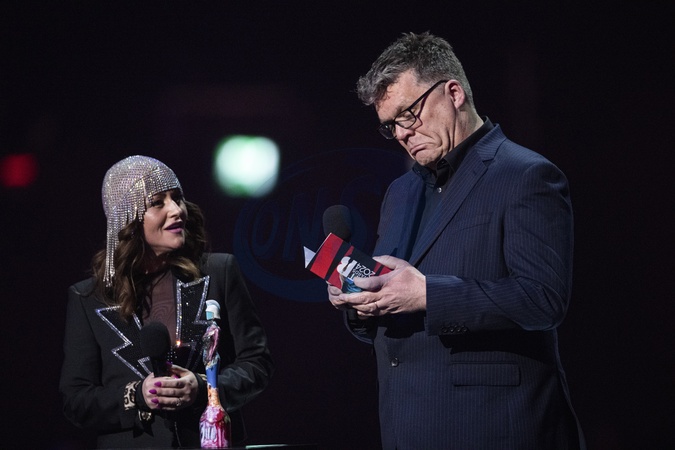 Jaime Winstone and Stuart Worden presenting the BRIT Award for Album of the Year at the 2024 BRIT Awards at The O2 Arena, London on 2 March 2024
