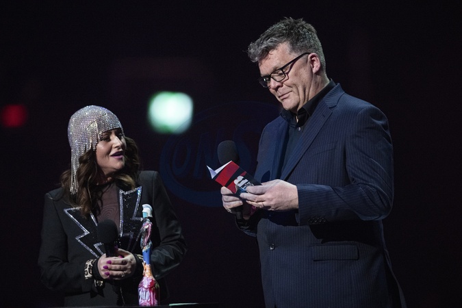 Jaime Winstone and Stuart Worden presenting the BRIT Award for Album of the Year at the 2024 BRIT Awards at The O2 Arena, London on 2 March 2024