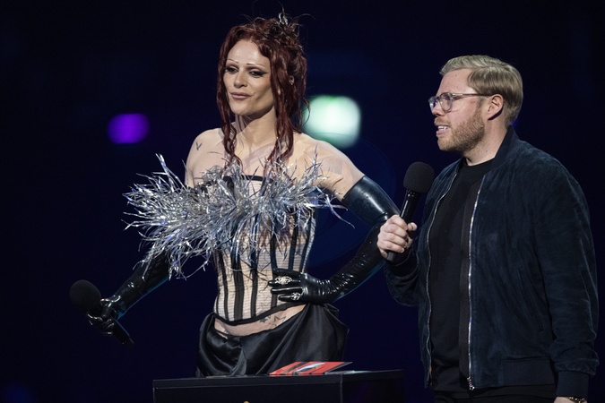Bimini Bon Boulash and Rob Beckett presenting the BRIT Award for International Song of the Year at the 2024 BRIT Awards at The O2 Arena, London on 2 March 2024