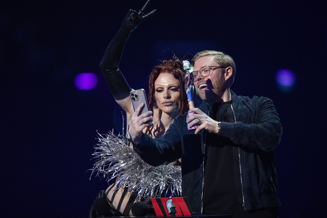 Bimini Bon Boulash and Rob Beckett presenting the BRIT Award for International Song of the Year at the 2024 BRIT Awards at The O2 Arena, London on 2 March 2024