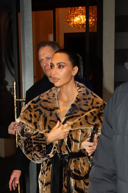 Kim Kardashian kontuzjowała palce lewej ręki w futrze ze zwierzęcym wzorem Balenciagi po spotkaniu w Maison Margiela na marginesie pokazu mody damskiej jesień/zima 2024-2025 podczas Tygodnia Mody w Paryżu