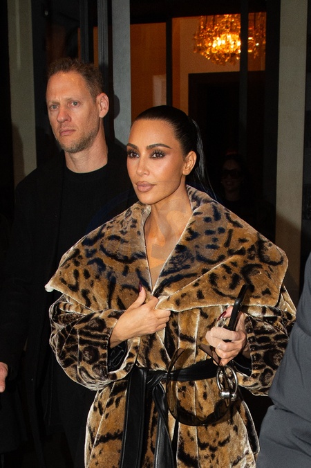 Kim Kardashian kontuzjowała palce lewej ręki w futrze ze zwierzęcym wzorem Balenciagi po spotkaniu w Maison Margiela na marginesie pokazu mody damskiej jesień/zima 2024-2025 podczas Tygodnia Mody w Paryżu