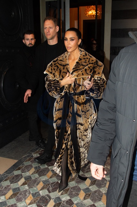 Kim Kardashian s'est blessée aux doigts de la main gauche dans un manteau de fourrure à imprimé animal Balenciaga à la sortie d'un déjeuner au Costes en marge de la mode femme automne / hiver 2024-2025 lors de la Fashion Week de Paris (PFW)