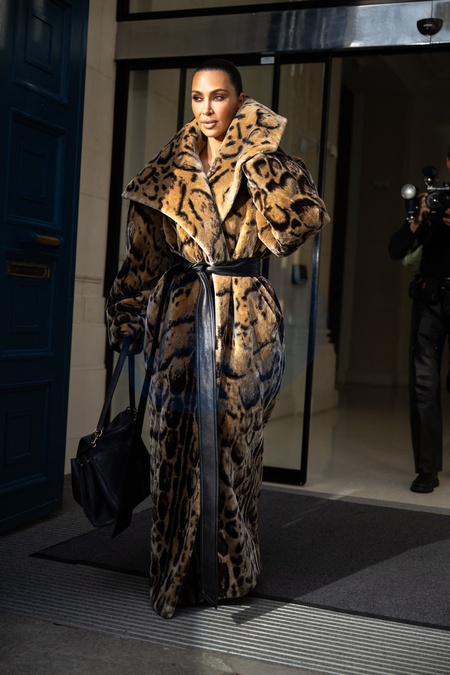Kim Kardashian kontuzjowała palce lewej ręki w futrze ze zwierzęcym wzorem Balenciagi po spotkaniu w Maison Margiela na marginesie pokazu mody damskiej jesień/zima 2024-2025 podczas Tygodnia Mody w Paryżu