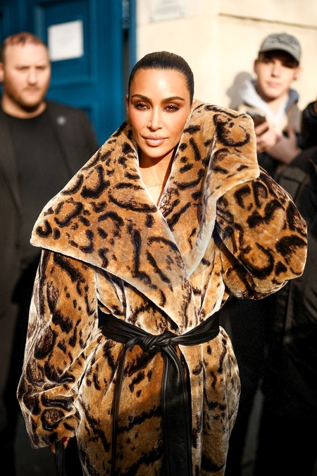 Kim Kardashian kontuzjowała palce lewej ręki w futrze ze zwierzęcym wzorem Balenciagi po spotkaniu w Maison Margiela na marginesie pokazu mody damskiej jesień/zima 2024-2025 podczas Tygodnia Mody w Paryżu