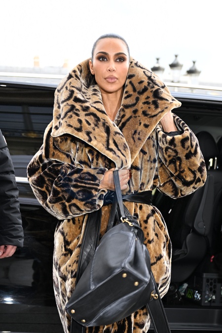 Kim Kardashian dans un manteau de fourrure à imprimé animal Balenciaga arrive à l'hôtel Ritz en marge de la mode femme automne / hiver 2024-2025 lors de la Fashion Week de Paris (PFW), à Paris, France, le 3 mars 2024. Kim Kardashian in a Balenciaga animal print fur coat arrives at the Ritz Hotel on the sidelines of the Fall/Winter 2024-2025 women's fashion show during Paris Fashion Week (PFW), in Paris, France, on March 3, 2024.