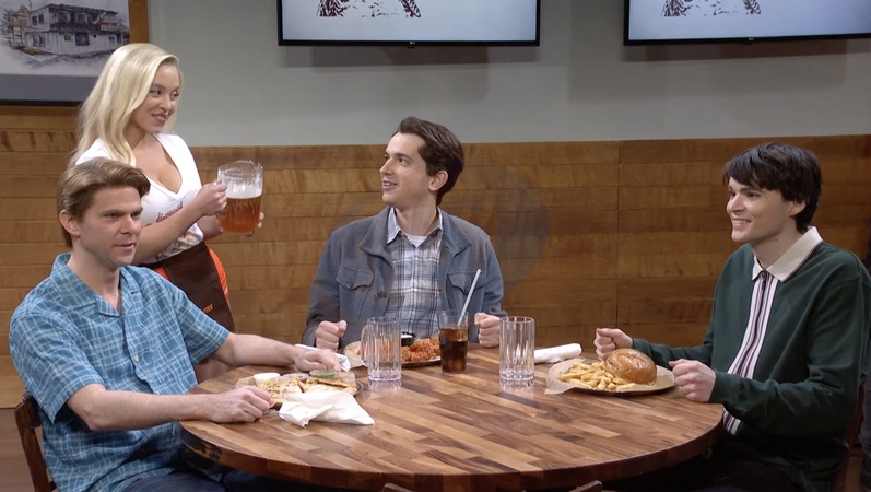 Pictures must credit: NBC / SNL Actress Sydney Sweeney pokes fun at her own curves — playing a waitress at burger chain Hooters who easily out-earns her coworkers with bug eyed customers giving her enormous tips. Hooters is known for the low-cut revealing uniforms of its waitresses. And in the sketch for US TV show Saturday Night Live, Sydney, 26, naively can't understand what makes her get such huge payouts from male customers. Her popularity soars even after she spills beer on a table and pours more of the ale down the throat of a reformed alcoholic putting him back on the booze. At the start of the sketch he tips acquired for the day by other waitresses played by Chloe Fineman, and Sarah Sherman came out to under $50 USD before Sweeney plonks down a tacks of bills totalling $36,000 USD. Picture supplied by JLPPA