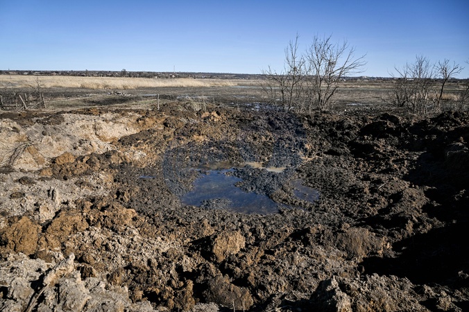ORIKHIV, UKRAINE - FEBRUARY 28, 2024 - A crater from a Russian KAB bomb is seen filled with water in the land plot of a local in Orikhiv, Zaporizhzhia region, southeastern Ukraine., Credit:Dmytro Smolienko / Avalon