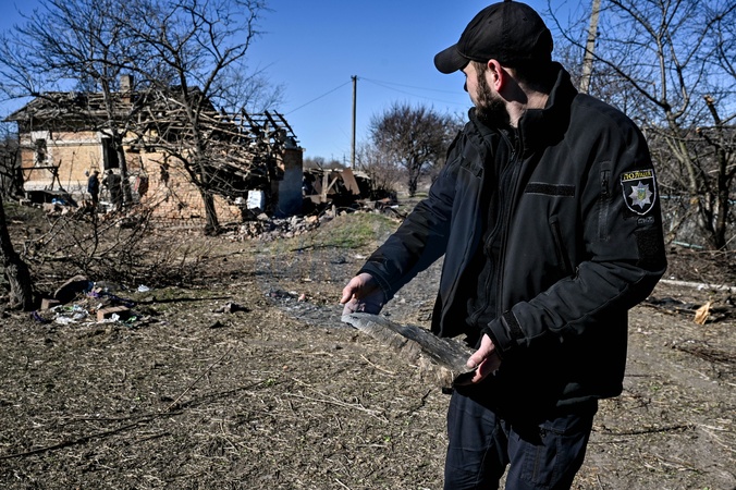 ORIKHIV, UKRAINE - FEBRUARY 28, 2024 - A police officer shows a fragment of a Russian KAB bomb which landed in Orikhiv, Zaporizhzhia region, southeastern Ukraine., Credit:Dmytro Smolienko / Avalon
