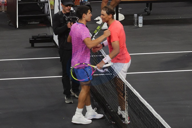 Carlos Alcaraz et Rafael Nadal - Rafael Junior assiste à la défaite de son père R.Nadal face à C.Alcaraz (6-3, 4-6, 14-12) lors du match d'exhibition Netflix Slam à Las Vegas, le 3 mars 2024. © Panoramic / Bestimage Merci de flouter le visage des enfants avant parution. Rafael Junior watches his father R.Nadal's defeat against C.Alcaraz (6-3, 4-6, 14-12) during the Netflix Slam exhibition match in Las Vegas, March 3rd, 2024. Please pixelate children faces before publishing.