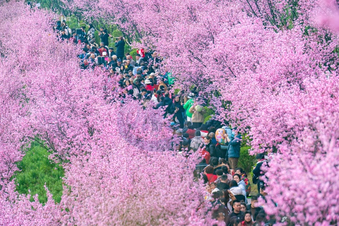 People admire the plum blossom in a park in southwest China's Chongqing Municipality Saturday, March 02, 2024., Credit:LI HONGBO / Avalon