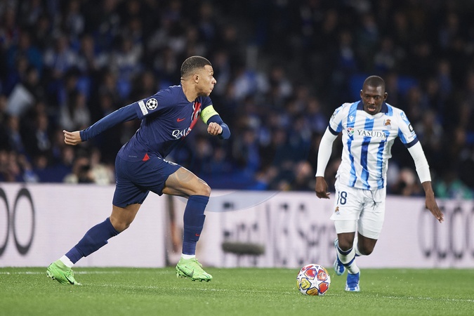 Kylian Mbappe of Paris Saint Germain in action during the UEFA Champions League match between Real Sociedad v Paris Saint Germain at Reale Arena on March 5, 2024 in San Sebastian (Photo by: LGM)