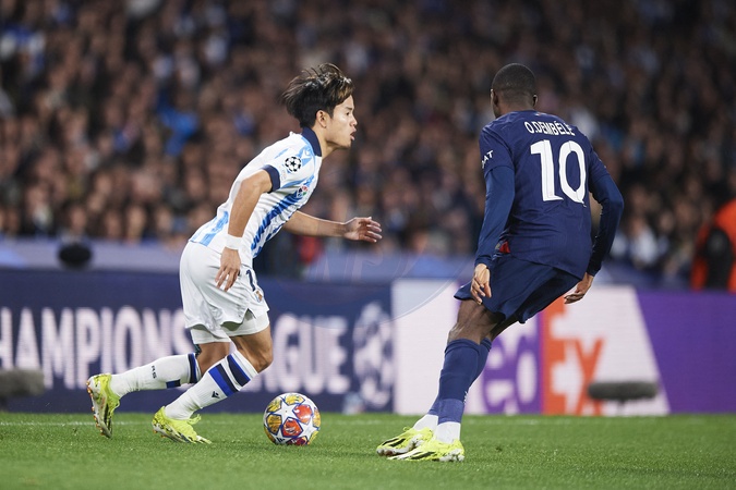 Takefusa Kubo of Real Sociedad in action during the UEFA Champions League match between Real Sociedad v Paris Saint Germain at Reale Arena on March 5, 2024 in San Sebastian (Photo by: LGM)