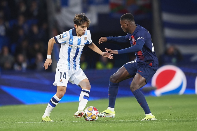 Takefusa Kubo of Real Sociedad dribbles during the UEFA Champions League match between Real Sociedad v Paris Saint Germain at Reale Arena on March 5, 2024 in San Sebastian (Photo by: LGM)