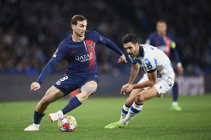 Fabián Ruiz of Paris Saint Germain runs with the ball during the UEFA Champions League match between Real Sociedad v Paris Saint Germain at Reale Arena on March 5, 2024 in San Sebastian (Photo by: LGM)