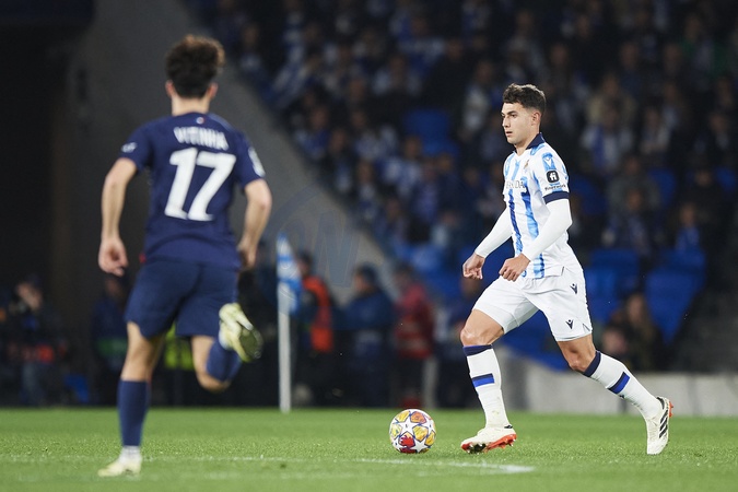 Martin Zubimendi of Real Sociedad during the UEFA Champions League match between Real Sociedad v Paris Saint Germain at Reale Arena on March 5, 2024 in San Sebastian (Photo by: LGM)