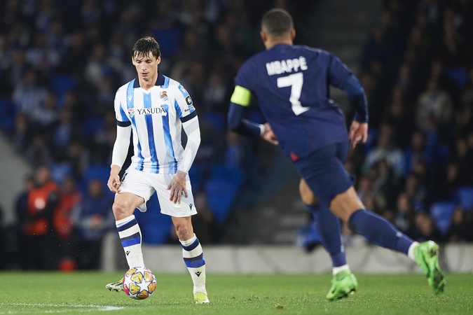 Robin Le Normand of Real Sociedad controls the ball during the UEFA Champions League match between Real Sociedad v Paris Saint Germain at Reale Arena on March 5, 2024 in San Sebastian (Photo by: LGM)