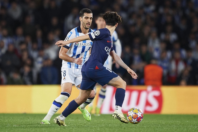 Mikel Merino of Real Sociedad in action during the UEFA Champions League match between Real Sociedad v Paris Saint Germain at Reale Arena on March 5, 2024 in San Sebastian (Photo by: LGM)