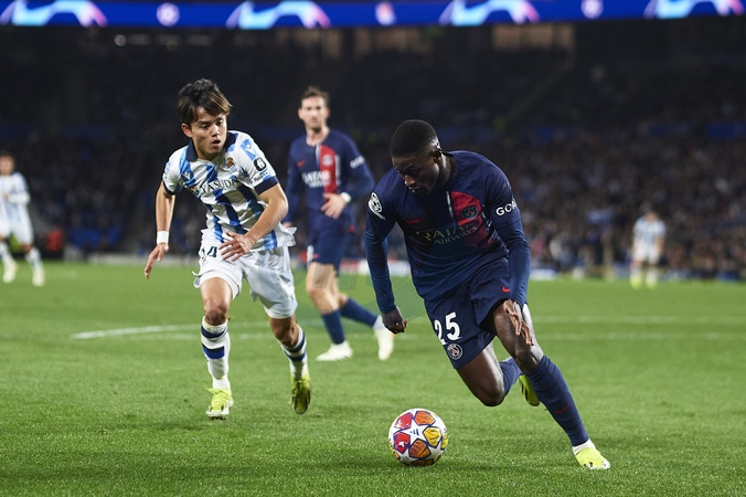 Nuno Mendes of Paris Saint Germain (R) being defended by Takefusa Kubo of Real Sociedad (L) during the UEFA Champions League match between Real Sociedad v Paris Saint Germain at Reale Arena on March 5, 2024 in San Sebastian (Photo by: LGM)