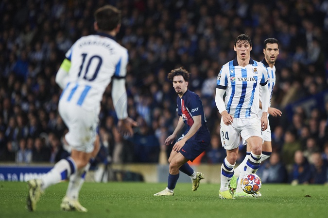 Robin Le Normand of Real Sociedad (R) battles for the ball with Vitinha of Paris Saint Germain (L) during the UEFA Champions League match between Real Sociedad v Paris Saint Germain at Reale Arena on March 5, 2024 in San Sebastian (Photo by: LGM)