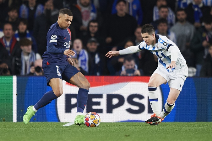 Kylian Mbappe of Paris Saint Germain looks to pass the ball during the UEFA Champions League match between Real Sociedad v Paris Saint Germain at Reale Arena on March 5, 2024 in San Sebastian (Photo by: LGM)