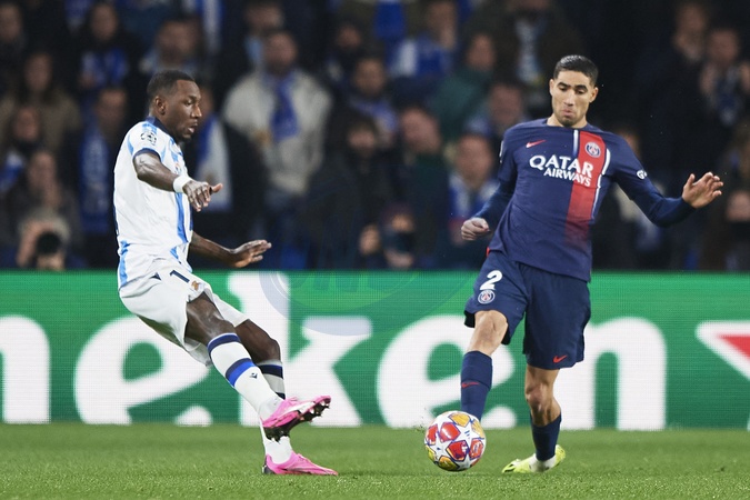 Achraf Hakimi of Paris Saint Germain controls the ball during the UEFA Champions League match between Real Sociedad v Paris Saint Germain at Reale Arena on March 5, 2024 in San Sebastian (Photo by: LGM)