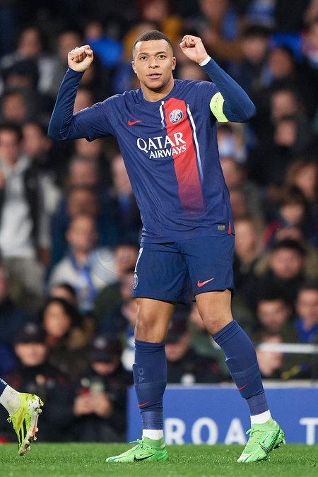 Kylian Mbappe of Paris Saint Germain celebrates his goal during the UEFA Champions League match between Real Sociedad v Paris Saint Germain at Reale Arena on March 5, 2024 in San Sebastian (Photo by: LGM)