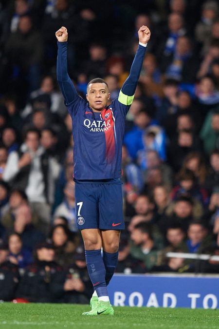 Kylian Mbappe of Paris Saint Germain celebrates his goal during the UEFA Champions League match between Real Sociedad v Paris Saint Germain at Reale Arena on March 5, 2024 in San Sebastian (Photo by: LGM)