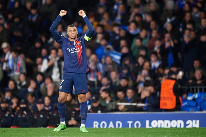 Kylian Mbappe of Paris Saint Germain celebrates his goal during the UEFA Champions League match between Real Sociedad v Paris Saint Germain at Reale Arena on March 5, 2024 in San Sebastian (Photo by: LGM)
