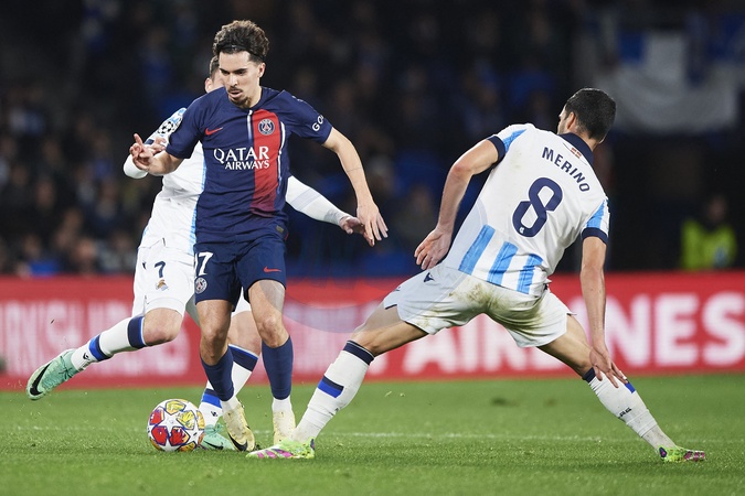 Vitinha of Paris Saint Germain dribbles during the UEFA Champions League match between Real Sociedad v Paris Saint Germain at Reale Arena on March 5, 2024 in San Sebastian (Photo by: LGM)