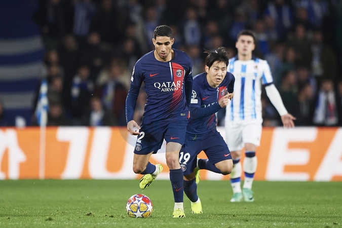 Achraf Hakimi of Paris Saint Germain in action during the UEFA Champions League match between Real Sociedad v Paris Saint Germain at Reale Arena on March 5, 2024 in San Sebastian (Photo by: LGM)