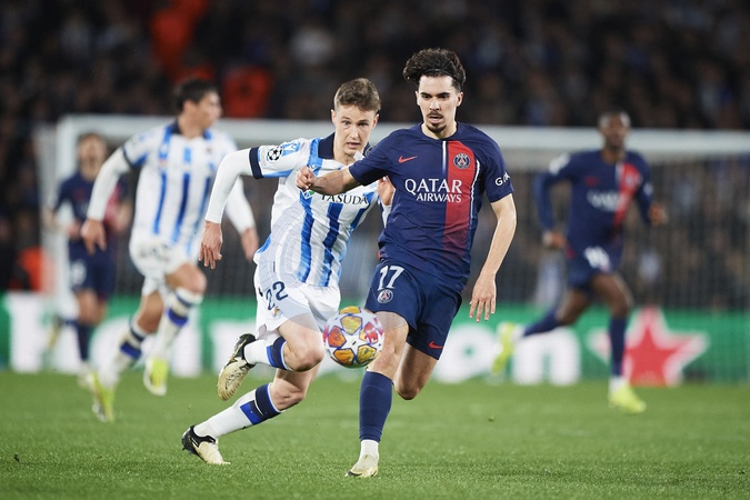 Vitinha of Paris Saint Germain in action during the UEFA Champions League match between Real Sociedad v Paris Saint Germain at Reale Arena on March 5, 2024 in San Sebastian (Photo by: LGM)