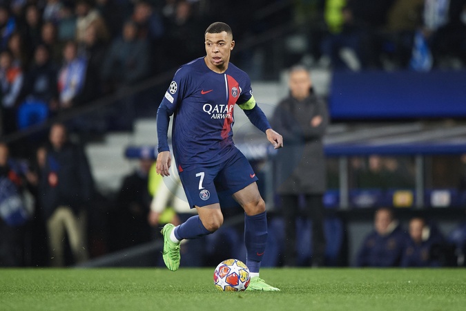 Kylian Mbappe of Paris Saint Germain runs with the ball during the UEFA Champions League match between Real Sociedad v Paris Saint Germain at Reale Arena on March 5, 2024 in San Sebastian (Photo by: LGM)